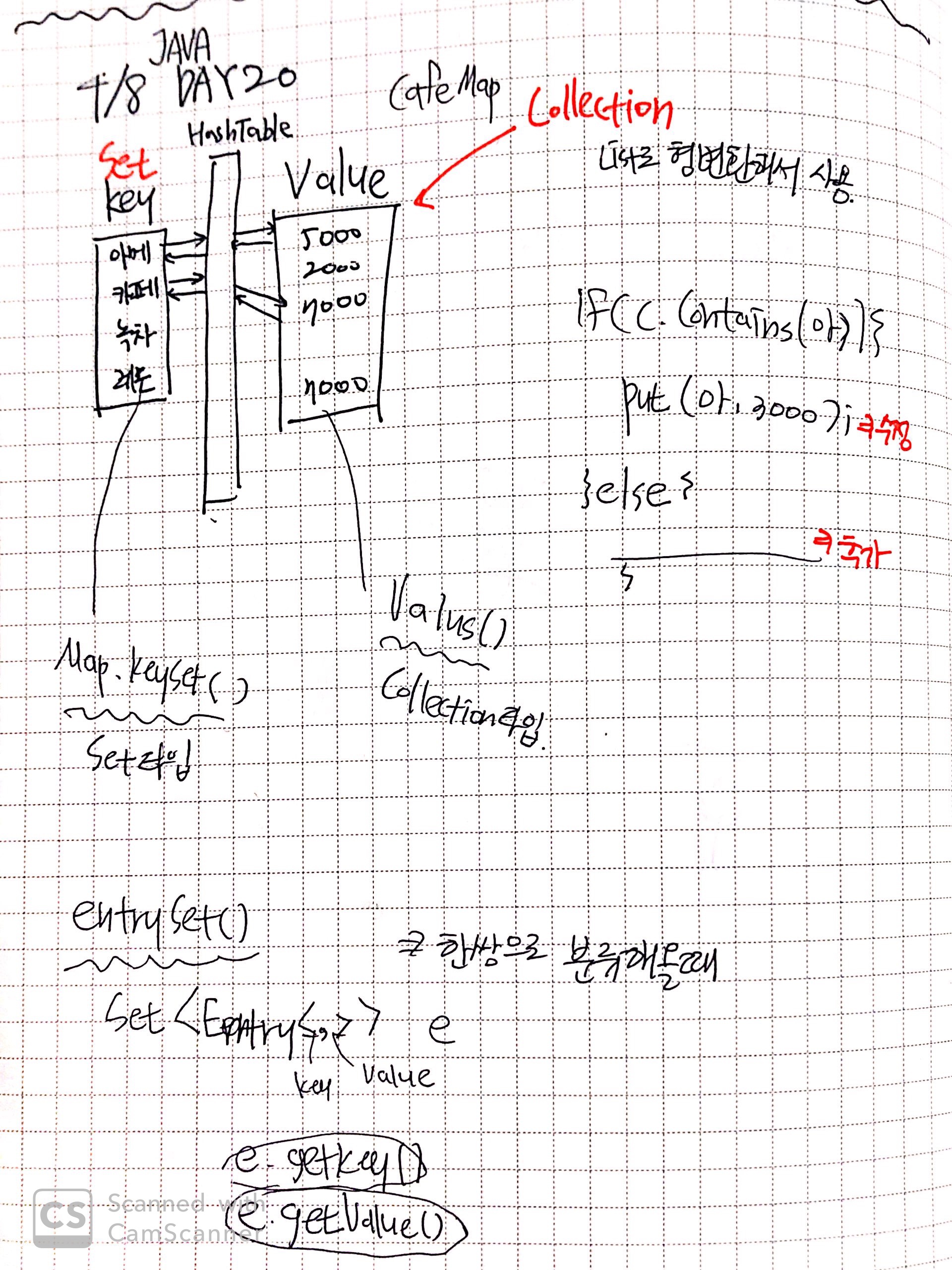 - key, value를 한 쌍으로 분류해오는 방법 : entrySet() -> Set타입(key값은 항상 중복이 불가능. 그래서 Set타입)